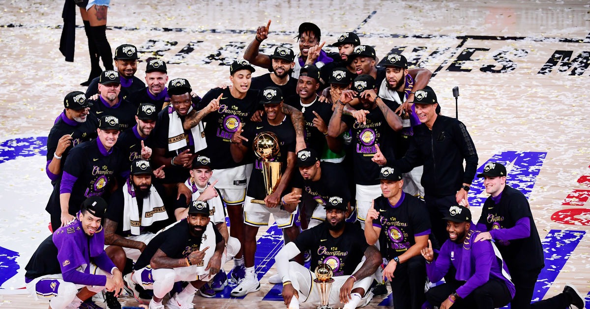 LAKE BUENA VISTA, FLORIDA – OCTOBER 11: The Los Angeles Lakers pose for a team photo with the trophy after winning the 2020 NBA Championship over the Miami Heat in Game Six of the 2020 NBA Finals at AdventHealth Arena at the ESPN Wide World Of Sports Complex on October 11, 2020 in Lake Buena Vista, Florida. NOTE TO USER: User expressly acknowledges and agrees that, by downloading and or using this photograph, User is consenting to the terms and conditions of the Getty Images License Agreement. (Photo by Douglas P. DeFelice/Getty Images)