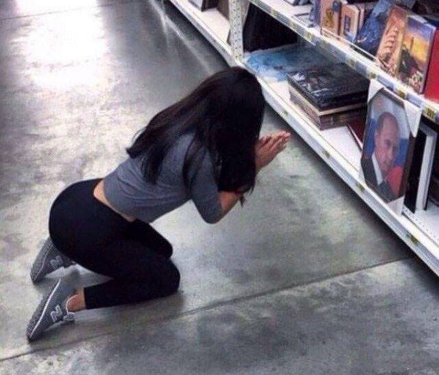It’s difficult for us to understand what’s actually happening in this picture. The young lady is actually kneeling before the portrait of the Russian president. What?.. Why?.. Is that some kind of weird spiritual ceremony? Is she actually praying? Well, that’s possible.